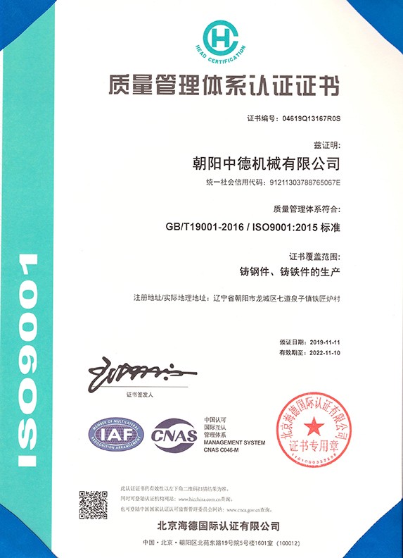 朝陽(yáng)中德機(jī)械有限公司座落于有著“東方佛都”之稱的三燕古都,歷史文化名城——朝陽(yáng),具體位置朝陽(yáng)市龍城區(qū)七道泉子鎮(zhèn)鐵匠爐村。公司創(chuàng)建于2006年5月是一家以鑄鋼件、鑄鐵件,集按用途設(shè)計(jì)、開發(fā)、生產(chǎn)、銷售于一體的,為機(jī)械設(shè)備配套的生產(chǎn)型公司。公司注冊(cè)資金1000萬(wàn),固定資產(chǎn)投資1480萬(wàn)元,主要生產(chǎn)設(shè)備GGW-5T,GGW-10T,GGW-10T中頻感應(yīng)爐;GDY-13C高溫電阻窯、GDY-9.5C電阻窯,M4000型直讀光譜儀,DP-3985型硬度測(cè)試儀,倒置式金相顯微鏡、拉伸試驗(yàn)機(jī)、超生波探傷儀,檢測(cè)手段完備。